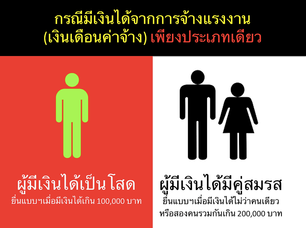 กรณีมีเงินได้จากการจ้างแรงงาน (เงินเดือนค่าจ้าง) เพียงประเภทเดียว ผู้มีเงินได้เป็นโสด: ต้องยื่นแบบฯ เมื่อมีเงินได้เกิน 100,000 บาท ผู้มีเงินได้มีคู่สมรส: ต้องยื่นแบบฯ เมื่อมีเงินได้ไม่ว่าคนเดียวหรือสองคนรวมกัน เกิน 200,000 บาท กรณีมีเงินได้จากการจ้างแรงงาน (เงินเดือนค่าจ้าง) และ มีเงินได้ประเภทอื่นด้วย หรือ กรณีมีเฉพาะเงินได้ประเภทอื่นที่ไม่ใช่เงินได้จากการจ้างแรงงาน ผู้มีเงินได้เป็นโสด: ต้องยื่นแบบฯ เมื่อมีเงินได้เกิน 60,000 บาท ผู้มีเงินได้มีคู่สมรส: ต้องยื่นแบบฯ เมื่อมีเงินได้ไม่ว่าคนเดียวหรือสองคนรวมกันเกิน 120,000 บาท กรณีกองมรดกของผู้ตาย ที่ยังมิได้แบ่ง ต้องยื่นแบบฯ เมื่อมีเงินได้เกิน 60,000 บาท กรณีห้างหุ้นส่วนสามัญ หรือ คณะบุคคล ที่มิใช่นิติบุคคล ต้องยื่นแบบฯ เมื่อมีเงินได้เกิน 60,000 บาท